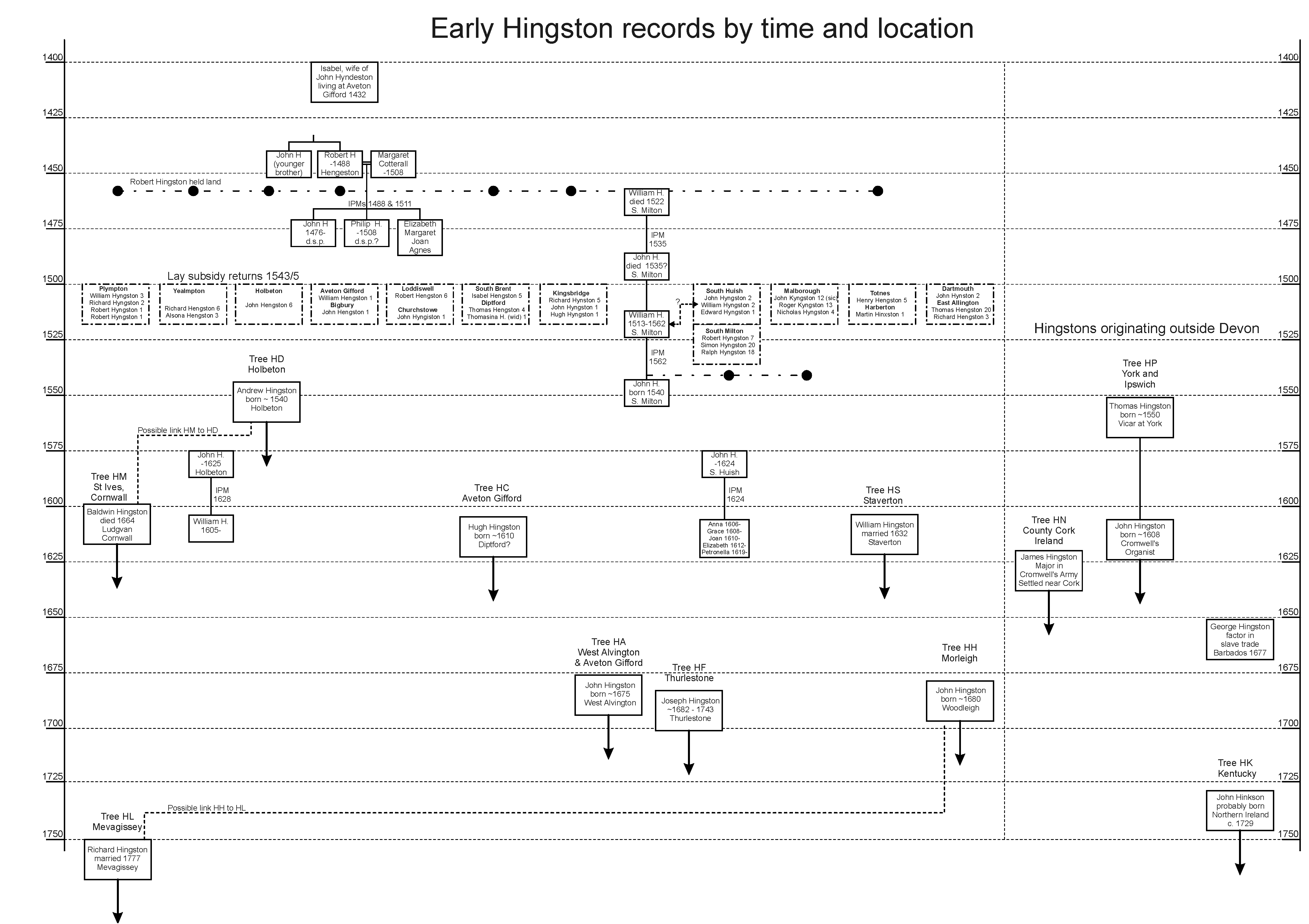 The chart below is an attempt to show both the geographic and temporal spread of the Hingston families before about 1700. The horizontal lines are at 25 year intervals and the top of each entry is roughly arranged by the approximate date of birth (I have assumed people marry at about 25 and die aged about 60 unless there is more detailed information). Each horizontal line thus represents about one generation. In the horizontal direction I show locations in the South Hams from Plymouth in the west to Dartmouth in the east. For each of the trees I show the oldest person we are reasonably certain about - details of their descendants are given elsewhere. I have shown those names that are listed in the 1543/5 Lay Subsidy returns on the assumption the people mentioned were born about 1500, but these dates may well be out by 20 years either way. I have included information from the IPMs in the relevant places and have indicated which land was held at the time of the IPMs. I think it very likely that the Robert Hingston who died in 1488, while living at Hingston Farm, is the direct descendant of the earliest people called Hingston. But if, as I suspect, his son Philip, who inherited his property, died leaving only daughters, then the Hingston name does not descend from Robert and Philip. However, Robert and Philip seem to have owned land in many of the places where Hingstons subsequently lived. It is quite possible that this land was occupied by other Hingstons - younger brothers or cousins. So if we are looking for a Hingston diaspora, spreading the name through the South Hams, it seems likely that it occurred from generations before Robert and Philip.