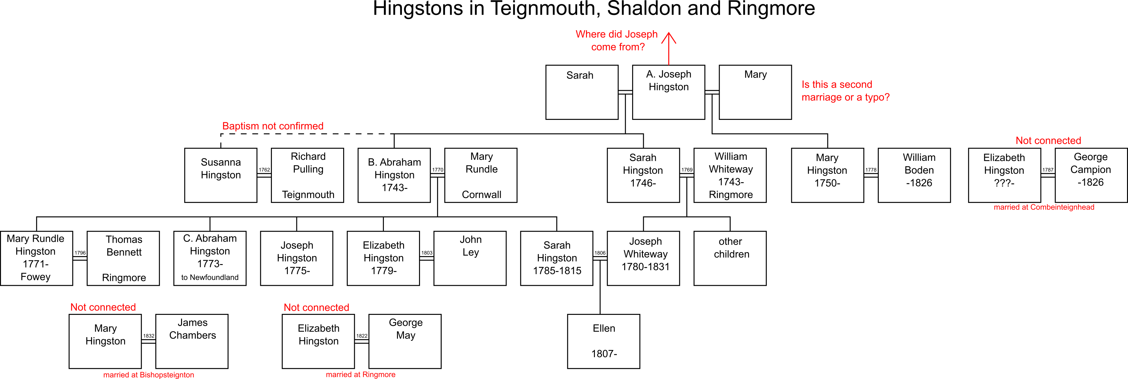- SARAH HINGSTON was baptised 3 Feb 1746 (OS) at Ringmore, the daughter of Joseph and Sarah Hingston. ( LD has this recorded as daughter of Abraham and Mary. ) On 30 Dec 1769 at Ringmore Sarah Hingston, spinster, married William Whiteway, mariner. He had been baptised 11 Aug 1743 at Ringmore. The witnesses Mark Whiteway, Joseph Hingston. They had children Sarah (who later married Nicholas Mudge of Torquay who was also involved in shipping); Mark; Elizabeth; Joseph bap Ringmore 15 Feb 1780 (who later married his cousin Sarah Hingston 13 Jan 1806); Mary (1780-1816); John; Abraham Hingston and Thomas (1790-1791?). Mary & Elizabeth are mentioned in William's will though Joseph is the only son mentioned so it is possible all the other sons died in childhood. The William Whiteway is presumably the man who co-owned many vessels with B. Abraham (see below).
